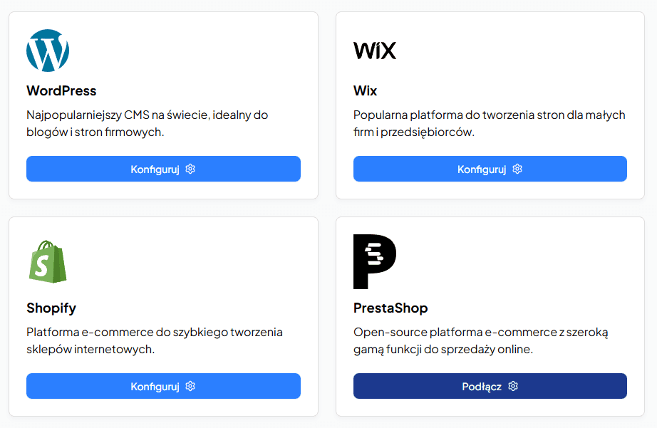 Tak! Oferujemy natywną integrację z WordPress, WooCommerce, Shoper, Wix, PrestaShop oraz dokumentacje dla programistów. Wystarczy zainstalować naszą wtyczkę i połączyć ją z kontem. Artykuły mogą być automatycznie publikowane jako szkice lub od razu na żywo - w zależności od Twoich preferencji.
