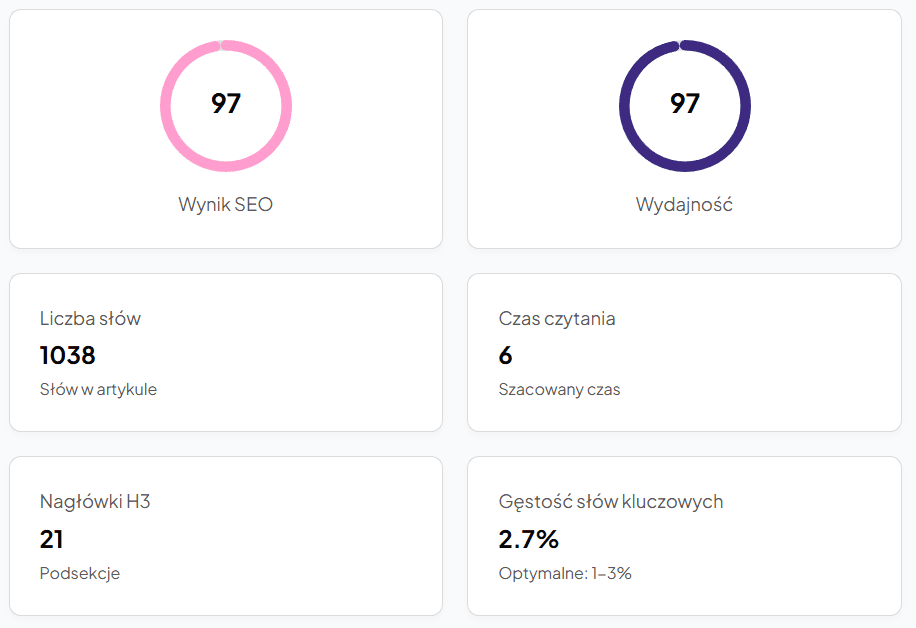 Absolutnie. Każdy wygenerowany artykuł jest w 100% unikalny i przechodzi przez nasz wewnętrzny system antyplagiatowy. Treści są optymalizowane pod kątem SEO - zawierają odpowiednią strukturę nagłówków, meta opisy oraz słowa kluczowe.